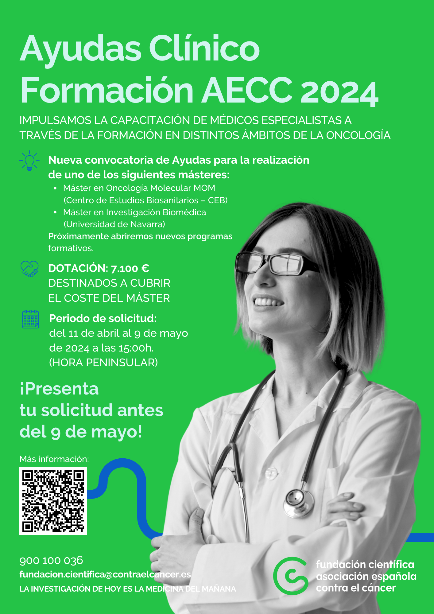 Nueva convocatoria de Ayudas Clínico Formación que hemos abierto desde la Asociación Española Contra el Cáncer con el objetivo de apoyar a médicos especialistas que deseen aumentar su capacitación profesional mediante la realización de un máster.