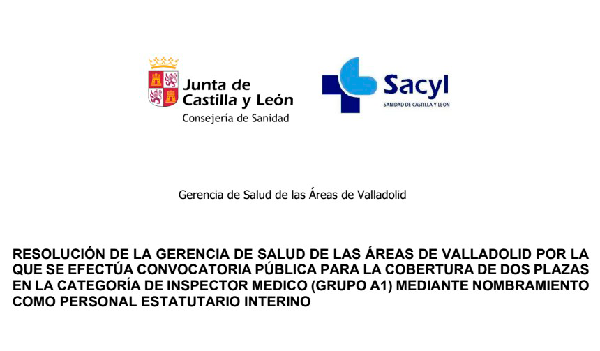 La Gerencia de Salud de las Áreas de Valladolid ha publicado una convocatoria pública para la cobertura de dos plazas en la categoría de Inspector Médico (Grupo A1) mediante nombramiento como personal estatutario interino.