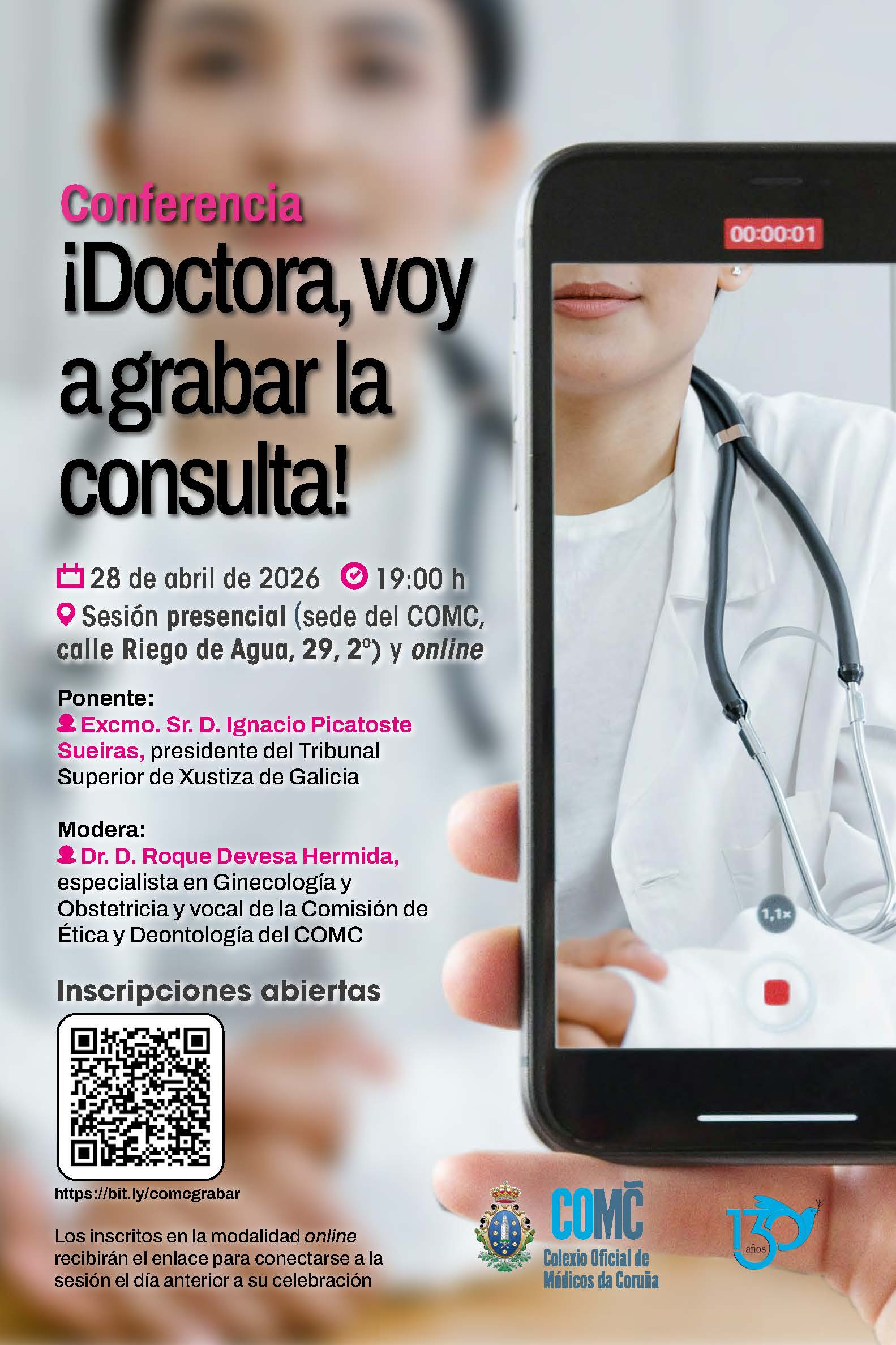 El Colegio Oficial de Médicos da Coruña (COMC) organiza la conferencia “¡Doctora, voy a grabar la consulta!”, una sesión centrada en los retos legales, éticos y profesionales que plantea la grabación de consultas médicas por parte de los pacientes.