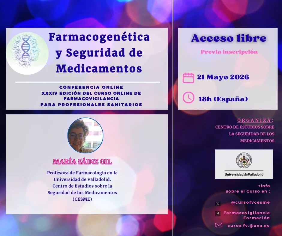Le invitamos a participar en la próxima clase sincrónica de la 34ª edición del Curso de Farmacovigilancia para Profesionales Sanitarios, organizado por el Centro de Estudios sobre la Seguridad de los Medicamentos (CESME) de la Universidad de Valladolid (España).
