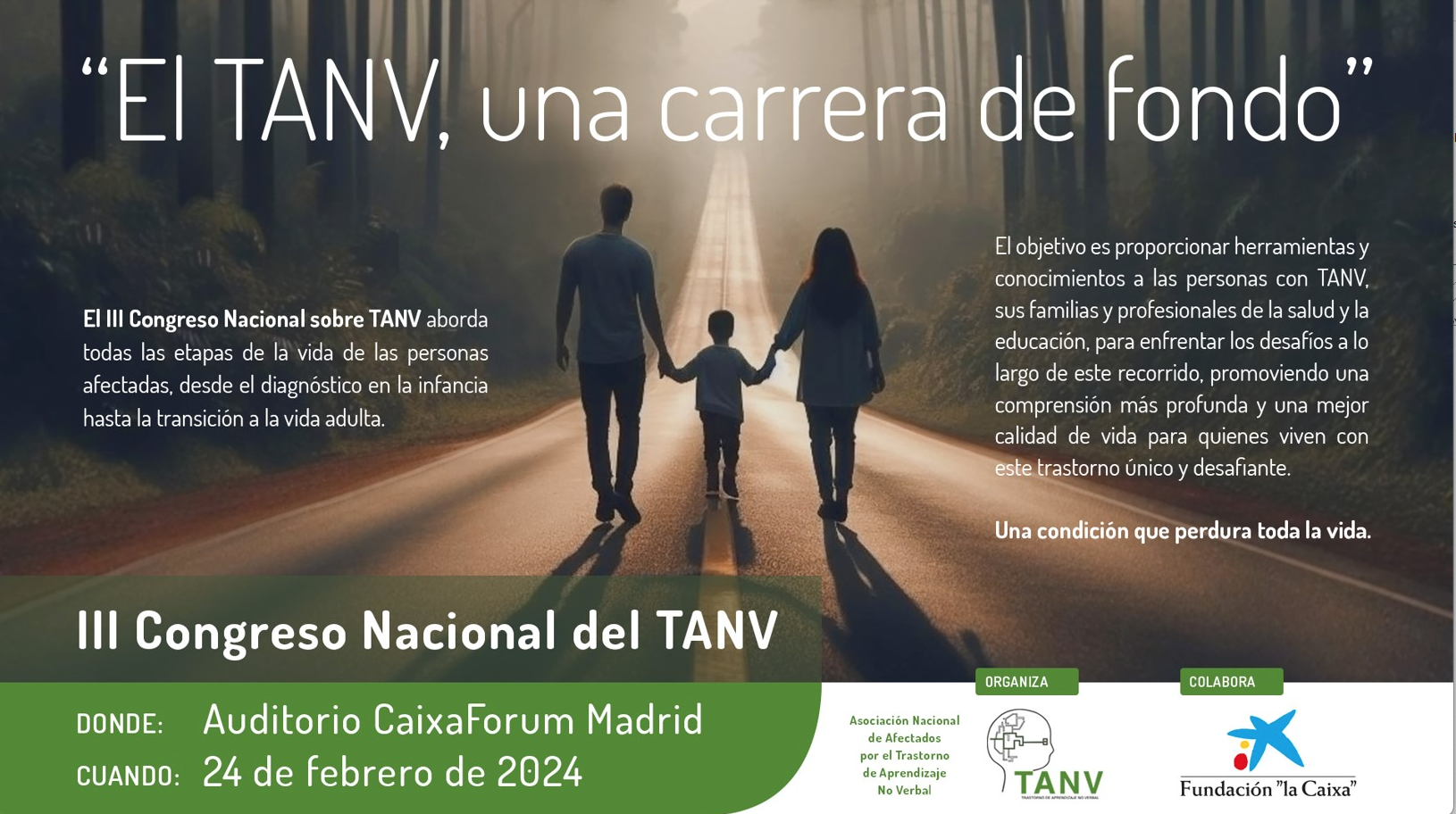 Nos complace informarles de que el próximo 24 de febrero de 2024 celebraremos el III Congreso Nacional sobre el Trastorno de Aprendizaje No Verbal bajo el lema “El TANV, una carrera de fondo”, que tendrá lugar en el auditorio de CaixaForum de Madrid.