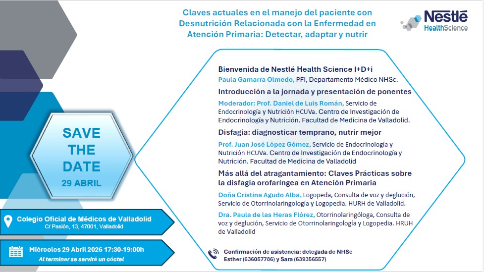 El Colegio Oficial de Médicos de Valladolid acogerá el próximo miércoles 29 de abril de 2026 la jornada formativa: “Claves actuales en el manejo del paciente con desnutrición relacionada con la Enfermedad en Atención Primaria: Detectar, adaptar y nutrir”