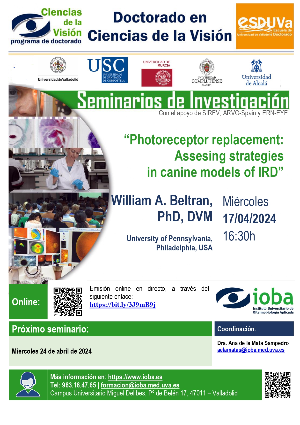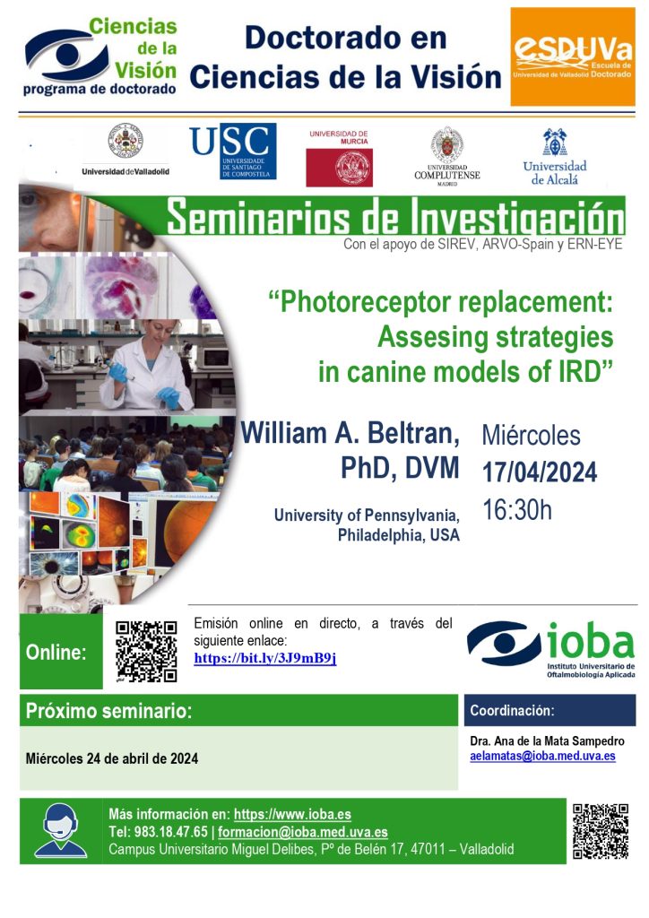 Seminario IOBA: «Photoreceptor replacement: Assesing strategiesin canine models of IRD» 17/04/24 – University of Pennsylvania, USA