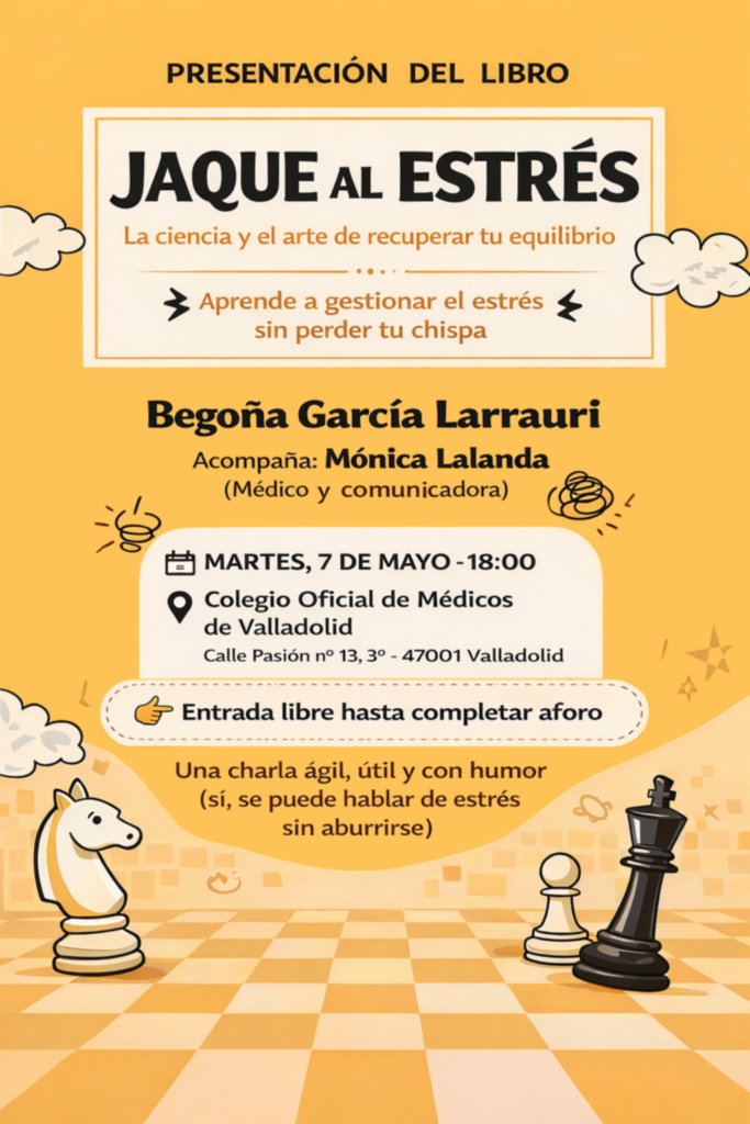 El próximo 7 de mayo a las 18:00 h, el Colegio Oficial de Médicos de Valladolid acogerá la presentación del libro Jaque al estrés. La ciencia y el arte de recuperar tu equilibrio, una obra de Begoña García Larrauri, doctora en Psicología y especialista en bienestar psicológico, educación positiva y sentido del humor.